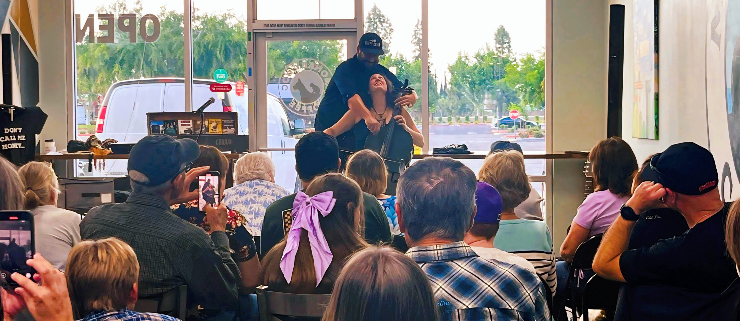 The intimate atmosphere of Monkey Dog Coffee allowed for a direct and engaging connection with the audience, fostered by Jason’s storytelling and their willingness to take requests. This performance by the core duo of Dirty Cello not only highlighted their exceptional musical talents, with Rebecca’s stunning vocals and instrumental versatility at the forefront, but also celebrated the special bond they share with the Clovis community and the unique charm of Monkey Dog Coffee.